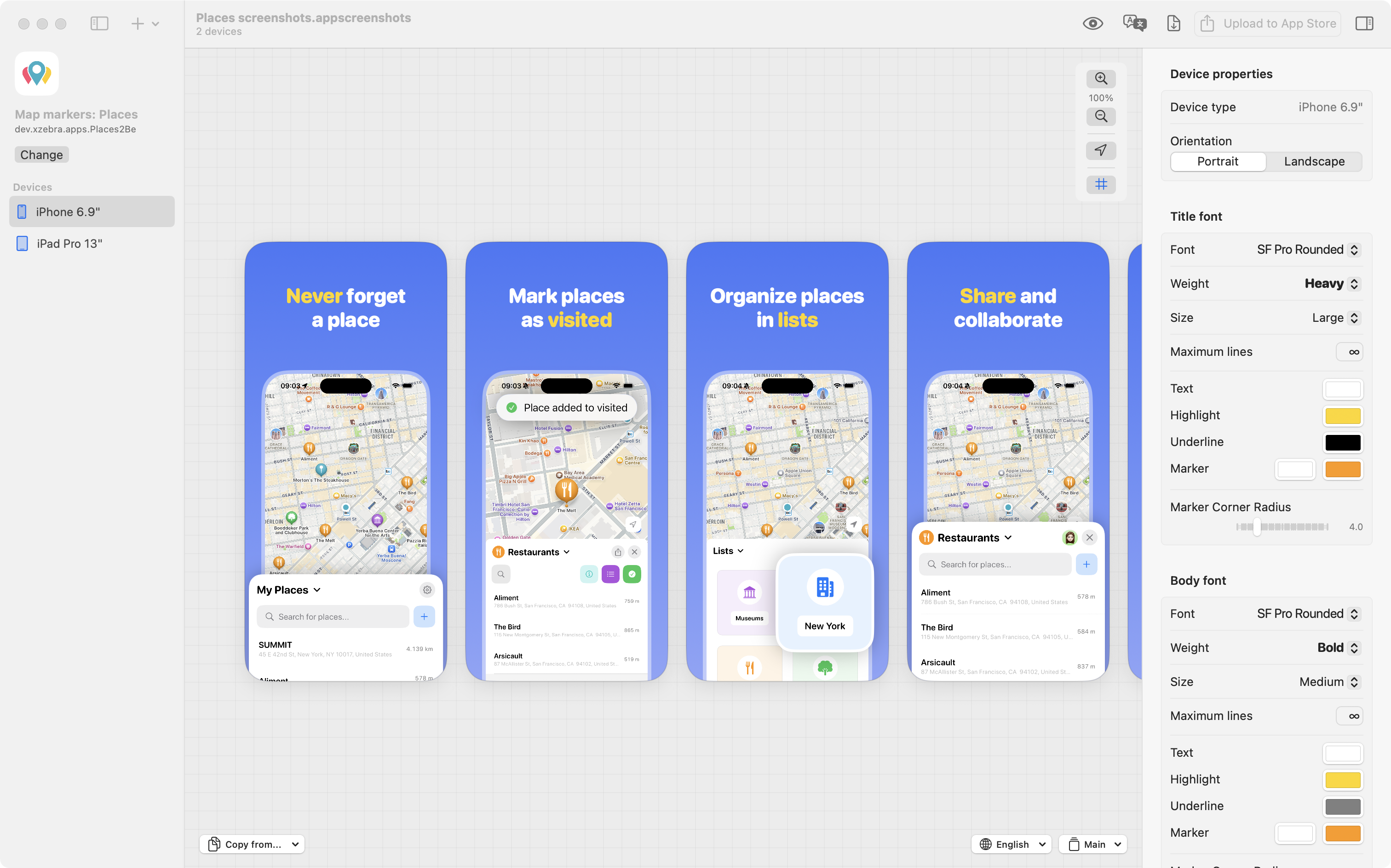 Import and export Xcode localization files seamlessly. Keep your screenshots in sync with your app's localization workflow.